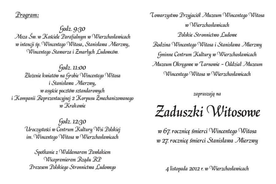 9:30 - Msza św. w Kościele Parafialnym w Wierzchosławicach w intencji św. Wincentego Witosa, Stanisława Mierzwy i zmarłych ludowców